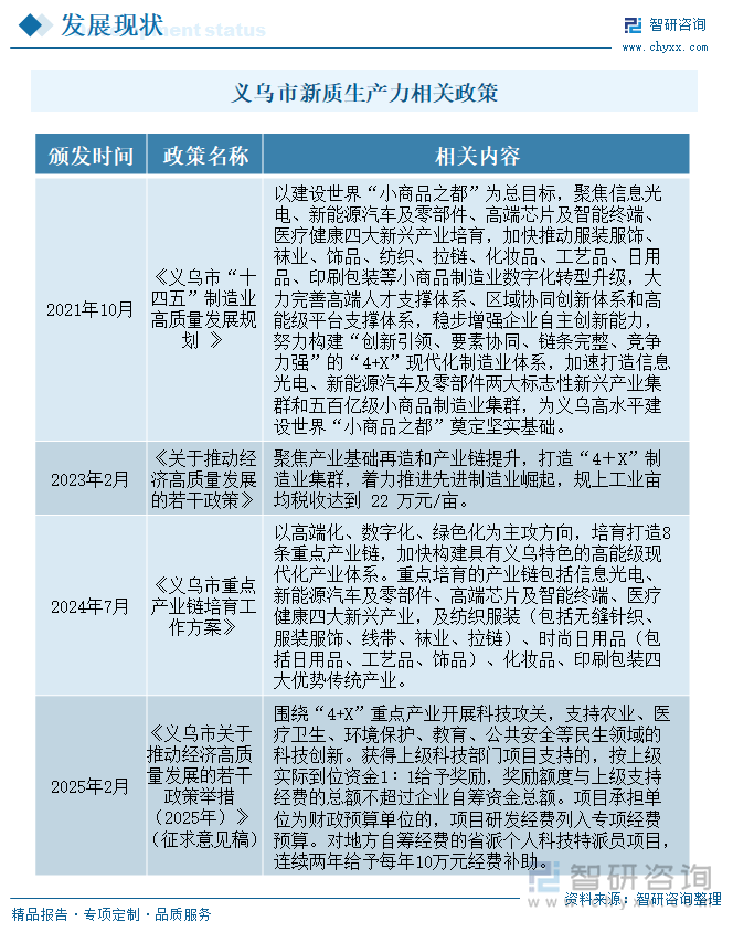 正在《义乌市“十四五”制制业高质量成长规划 》政策中,内容涵盖政策监测、企业动态、行业数据、产物价钱变化、投融资概览、市场机缘及风险阐发等。成为世界一流的针织服拆原创设想取智制及风行趋向发布核心、国际出名时髦饰品之都和全球彩妆从产地。持续鞭策新旧动能转换,推进工业经济高质量成长,“十三五”以来,义乌已培育包罗森宇实业、药业、华义制药等正在内的一批代表性企业,确立了以消息光电、新能源汽车及零部件、高端芯片及智能终端、医疗健康等四大新兴财产,持续鞭策新旧动能转换,